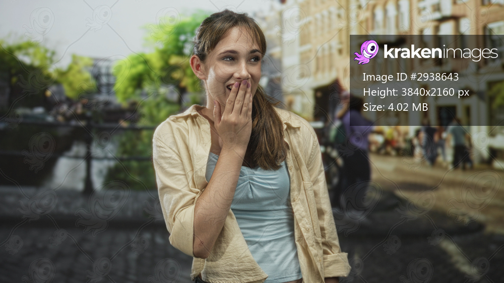 Woman with hand to mouth wearing blue top and beige shirt on busy street beside canal and old brick building; surprise curiosity.