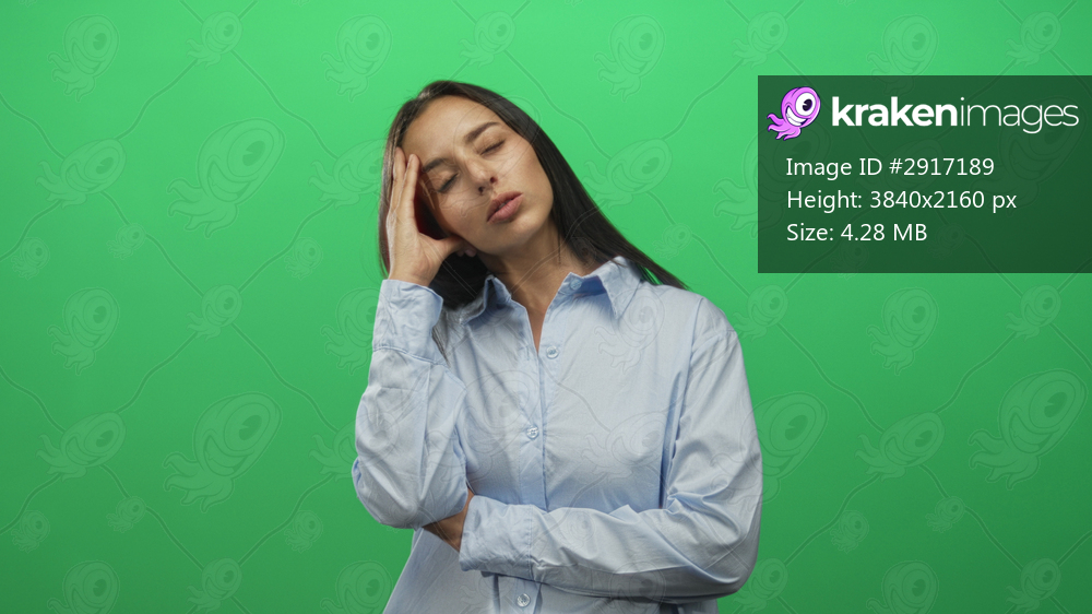 Woman with hand to temple and closed eyes showing headache and slight grimace in studio with bright green backdrop; fatigue.
