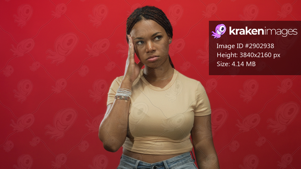 Woman with hand to temple and closed eyes wearing beige crop top and bracelets in a studio with red wall; fatigue headache.