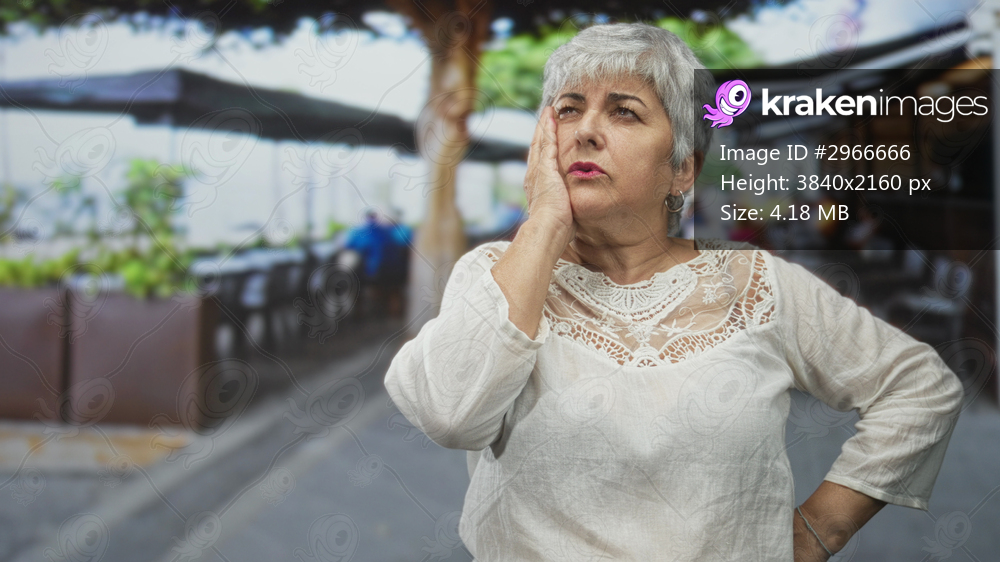 Woman with hand to temple and other hand on hip at street cafe terrace wearing white lace blouse; concern contemplation.