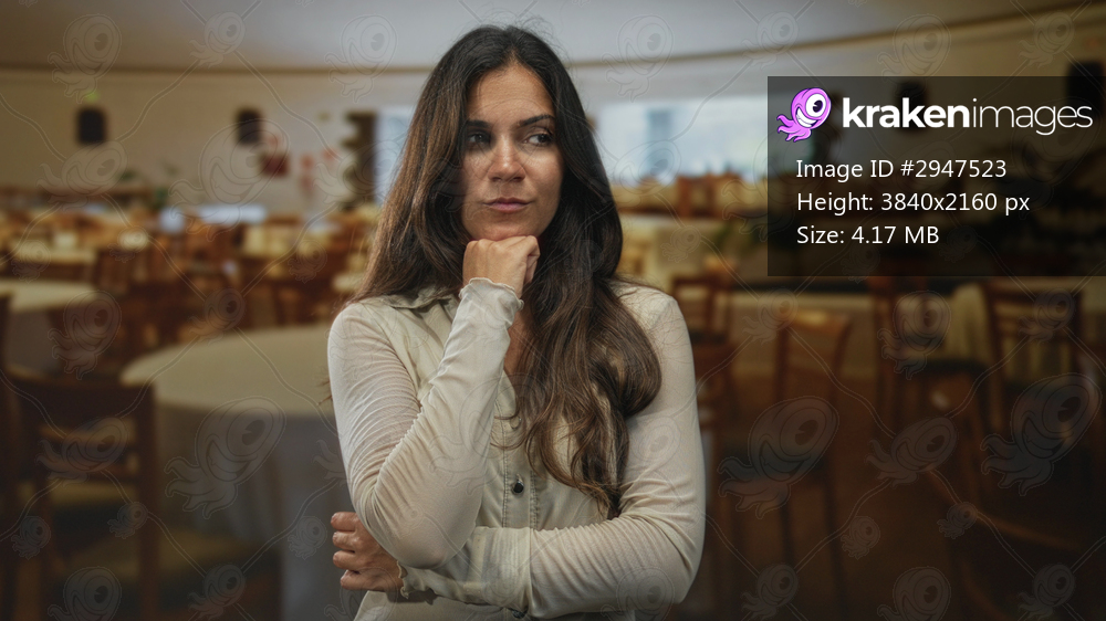 Woman with hand under chin and crossed arms at a round table in a restaurant building; thoughtful introspection doubt.