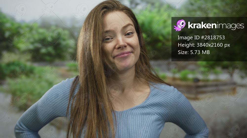 Woman hand wave gesture with tilted head and relaxed shoulders in forest clearing; joy playfulness laughter.