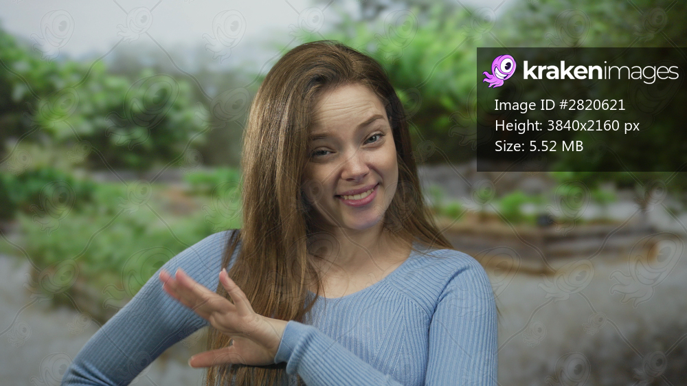 Woman hand wave gesture with tilted head and relaxed shoulders in forest clearing; joy playfulness laughter.