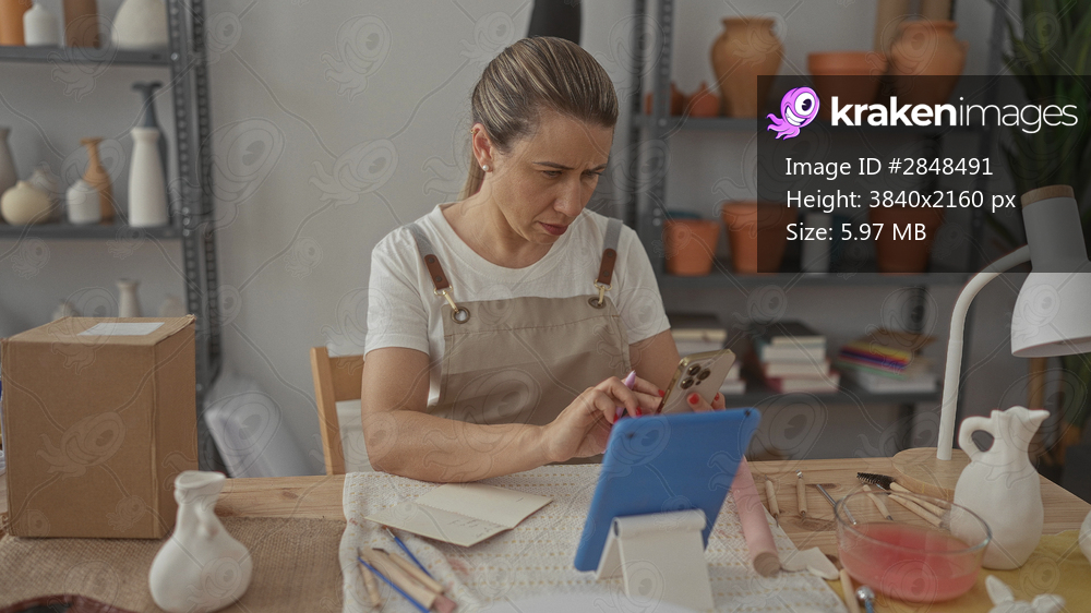 Woman hand writes note with pen and taps tablet screen on wooden table in pottery studio; creative concentration.