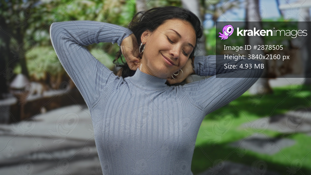 Woman with hands behind neck stretching in forest park scene, eyes closed smiling, wearing blue sweater and hoop earrings; serenity rest.