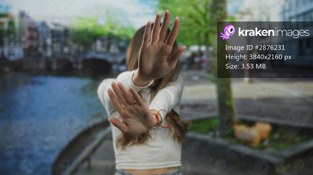 Woman with hands blocking her face on a street canal in amsterdam, palms raised in defensive stop gesture; self protection fear.