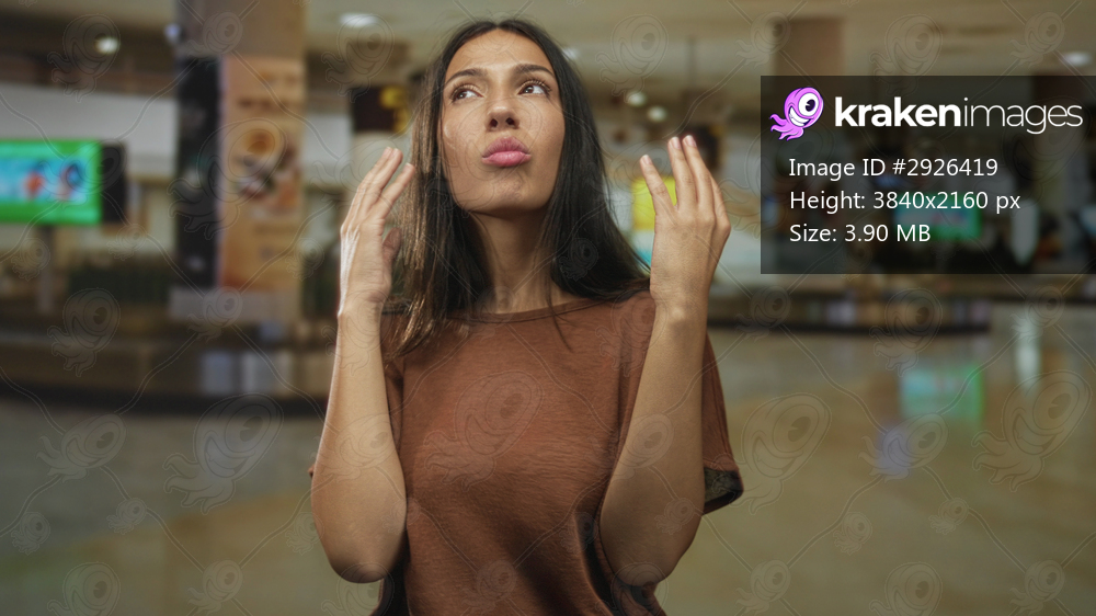 Woman with hands by temples in airport terminal, lips pursed and eyes closed while waiting at baggage claim; travel stress.