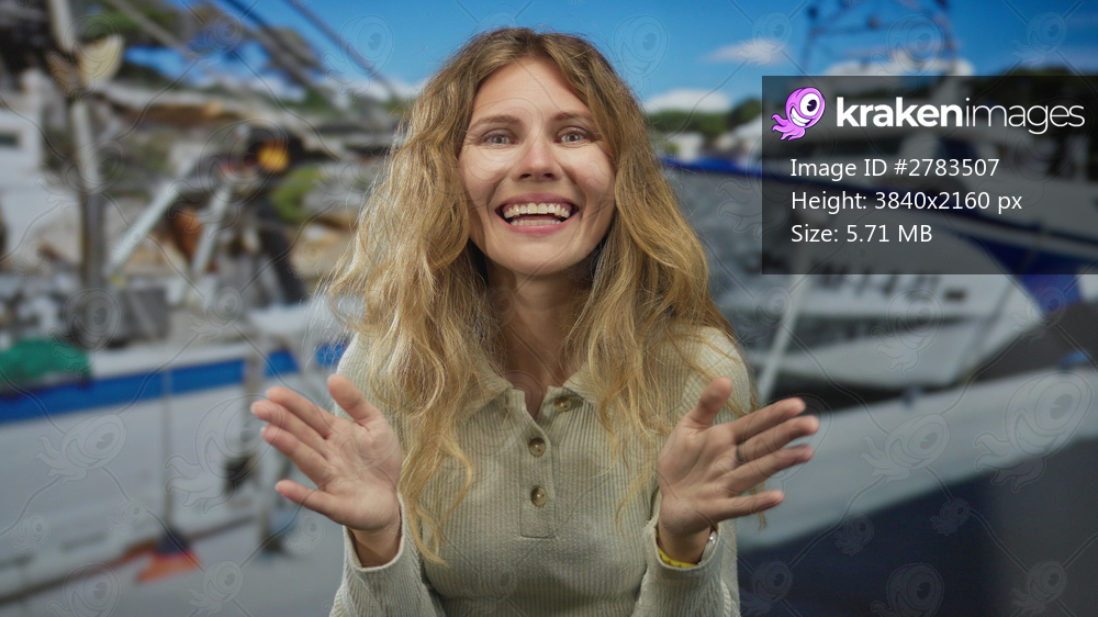 Woman with hands clapping at a marina appears blonde young smile joy next to yacht boat.