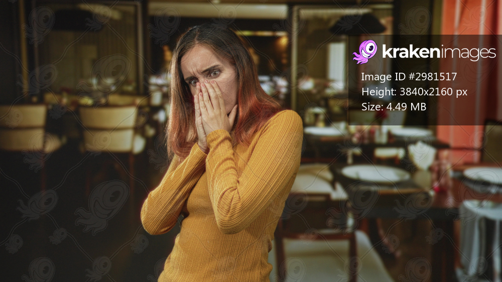 Woman with hands clasped at chest and tense expression in yellow sweater pleading in a restaurant; anxiety.