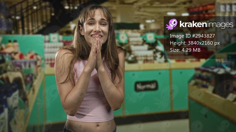Woman with hands clasped at mouth inside mall building showing a pleading gesture and visible midriff; hope wish.