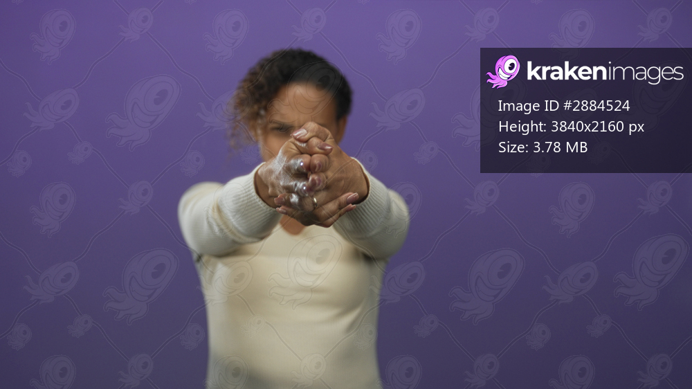 Woman with hands clasped and extended pointing forward in purple studio, facing camera with an intense expression; determination resilience strength.