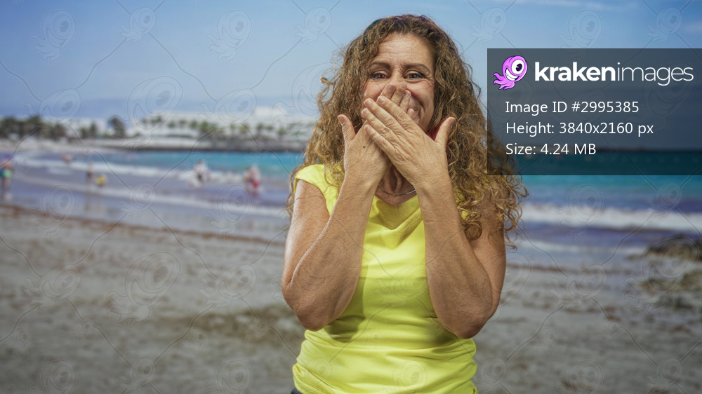 Woman with hands clasped and finger to lips for silence at beach, smiling toward camera in yellow top; playful secret.