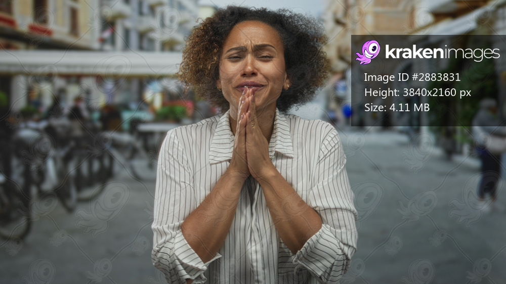 Woman with hands clasped in prayer, fingers visible, wearing a striped shirt and smiling on a busy city street; hope faith.