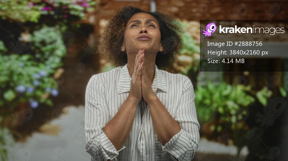 Woman with hands clasped in prayer in front of a building, eyes closed and smiling with head slightly tilted; hope prayer faith.