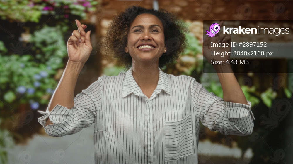 Woman with hands clasped in prayer in front of a building, eyes closed and smiling with head slightly tilted; hope prayer faith.