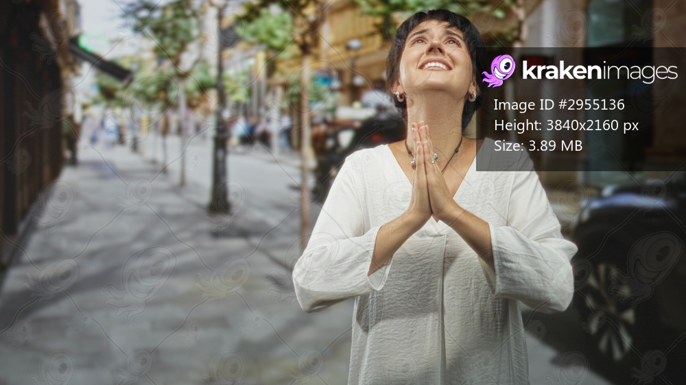 Woman with hands clasped in prayer on a busy city street, eyes upturned, wearing white tunic and necklace; hopeful gratitude.