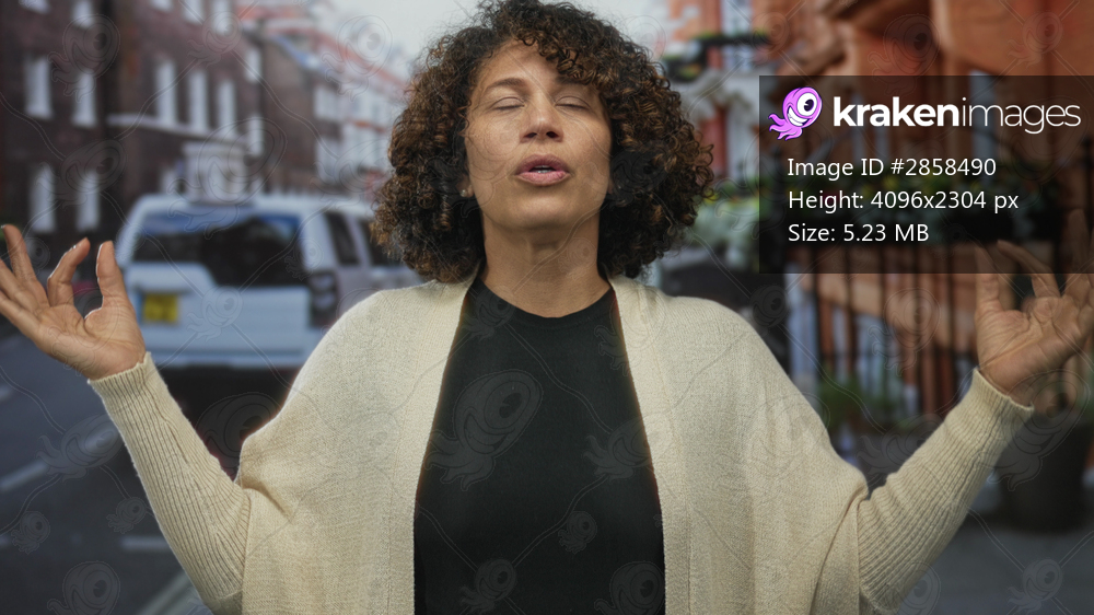 Woman with hands clasped in prayer on a city street, wearing cardigan over dark top and looking upward; faith hope serenity.