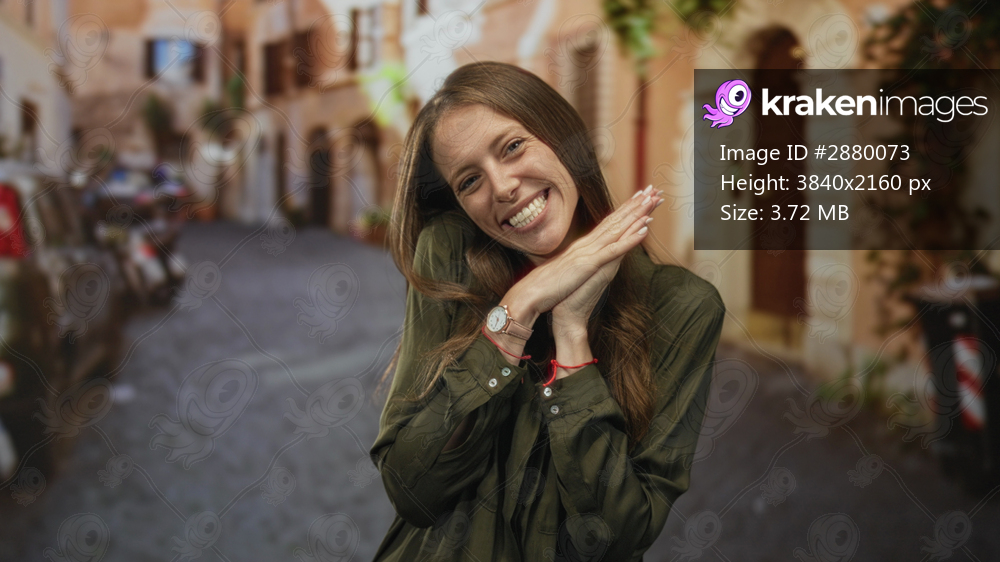 Woman with hands clasped in prayer on a sunlit cobblestone street near old buildings, laughing with closed eyes; joy gratitude.