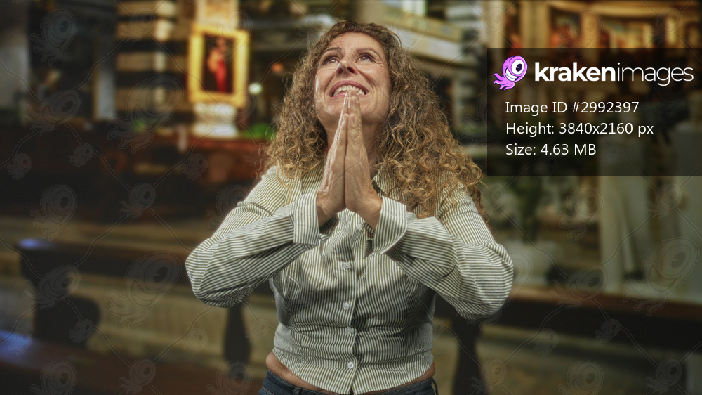 Woman with hands clasped in prayer, palms together and face uplifted, curly hair visible and bare hands held near chest inside church building; devotion hope relief. - Kraken Images