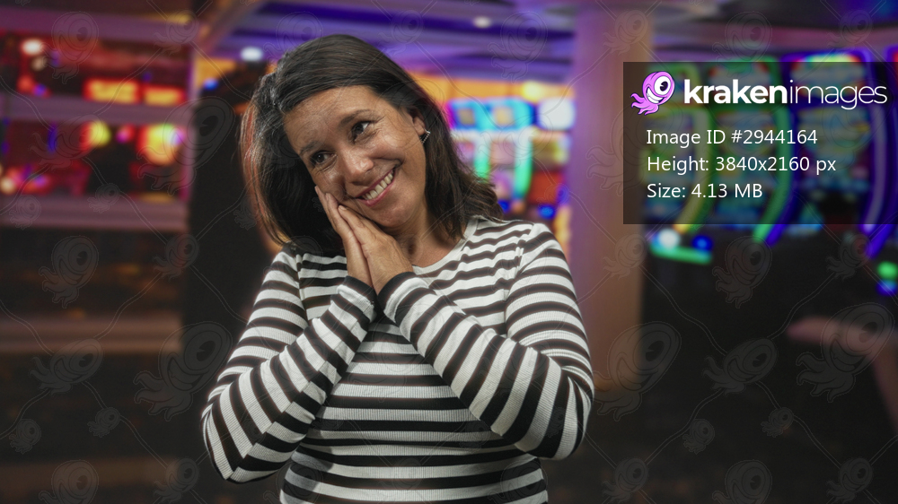 Woman with hands clasped near cheek smiling by slot machines in a casino building, touching hair and tilting head in a playful gesture; joy.