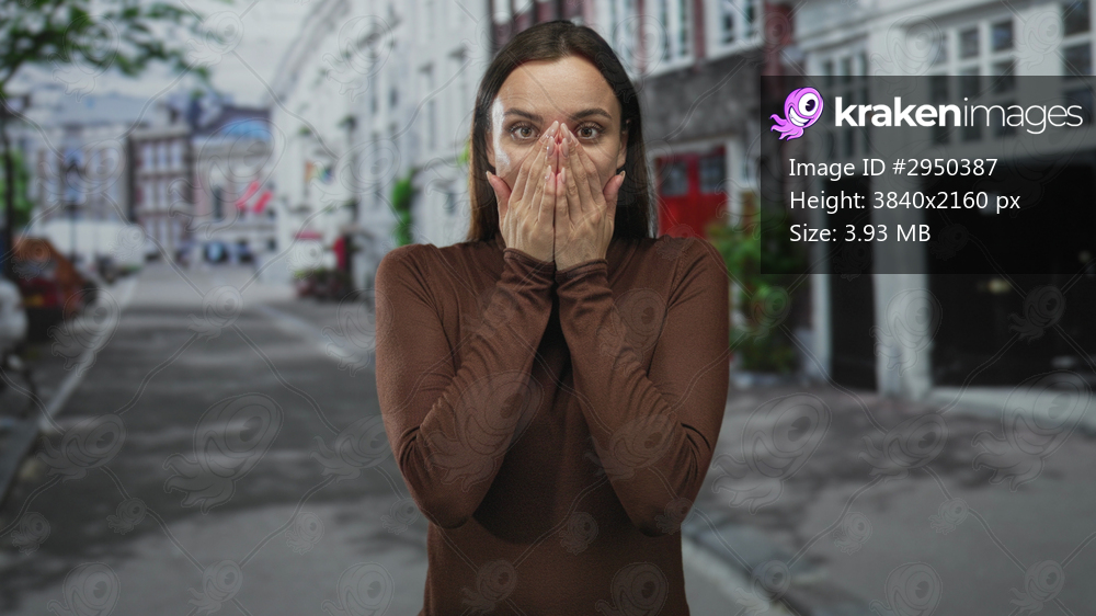 Woman with hands clasped near face smiling broadly while wearing brown turtleneck on a street lined with buildings; simple joy.