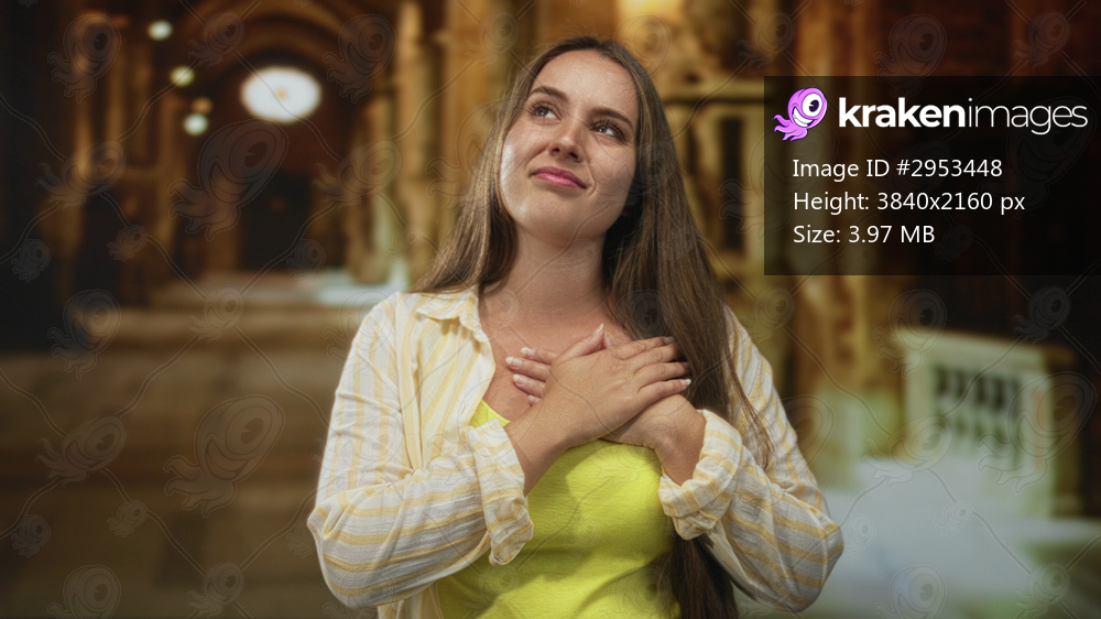 Woman with hands clasped over chest in church aisle wearing yellow shirt under a striped shirt, soft smile and closed eyes; gratitude reflection.