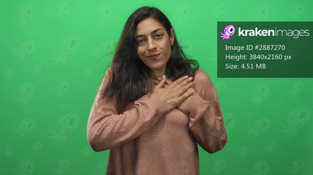 Woman with hands clasped over chest wearing pink sweater and necklace in green studio setting; gratitude self care.