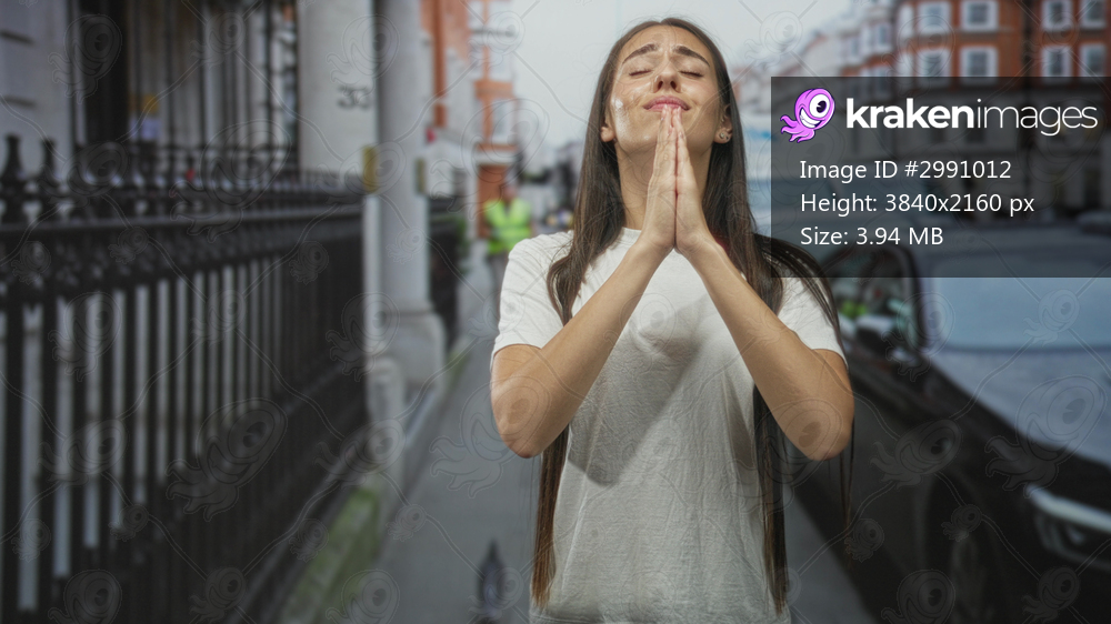 Woman with hands clasped praying on a street in a city near parked cars and an iron fence; reflection hope serene.