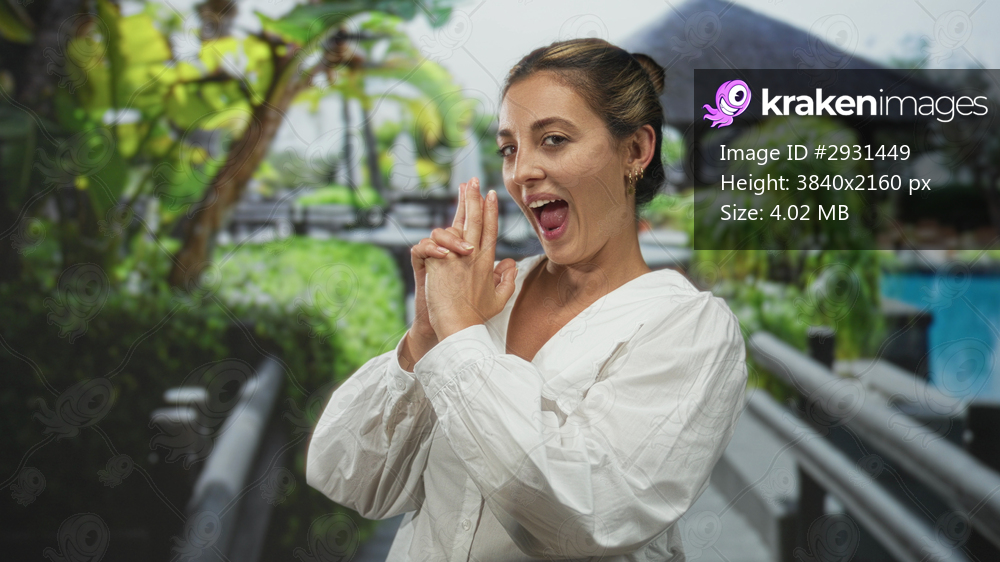 Woman with hands clasped and pursed lips in a finger gun gesture at resort poolside bridge; playful relaxation.