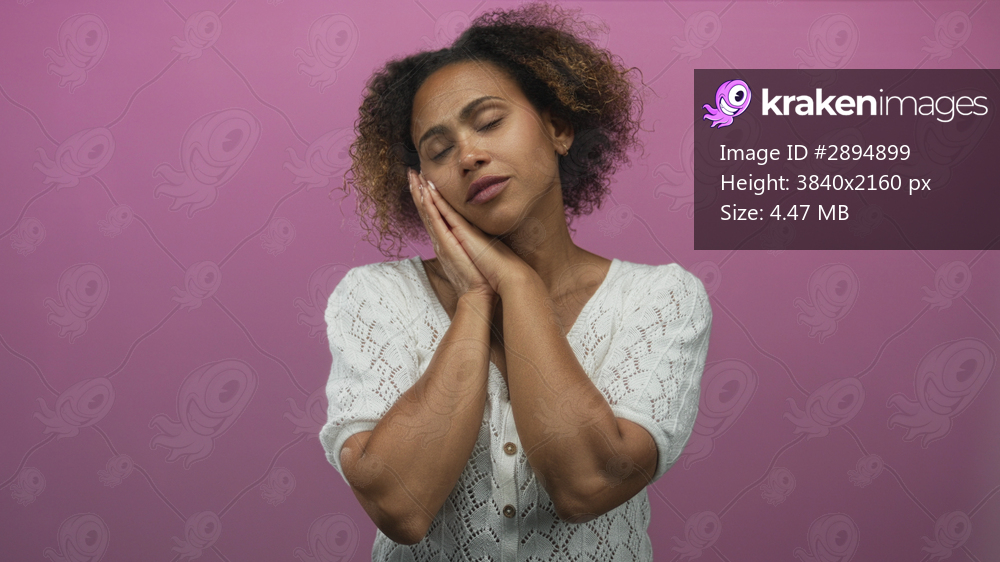 Woman with hands clasped to cheek in a sleeping gesture wearing a white knit sweater in a pink studio; rest and relaxation.