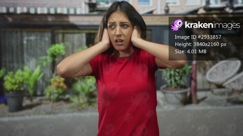 Woman with hands covering ears and a frown in front of a residential building entrance wearing red shirt; annoyance.