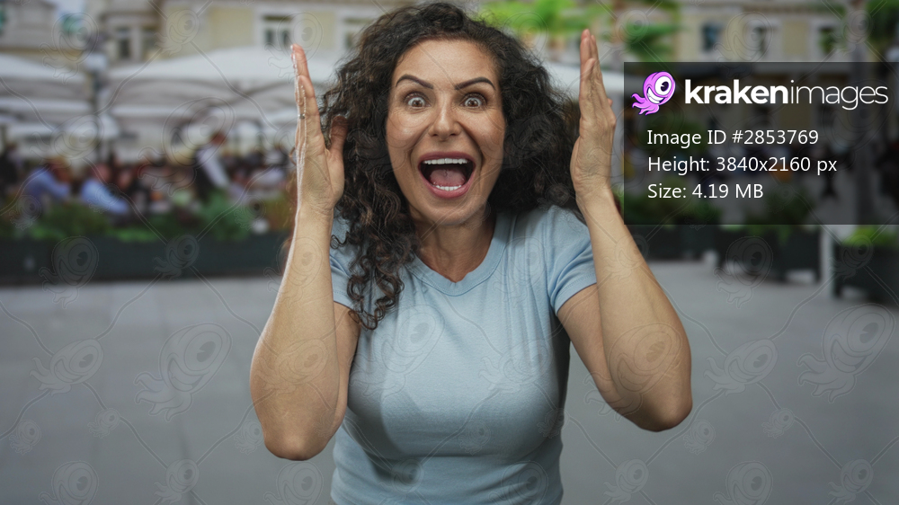 Woman with hands covering eyes on street terrace in front of outdoor cafe umbrellas; playful surprise.