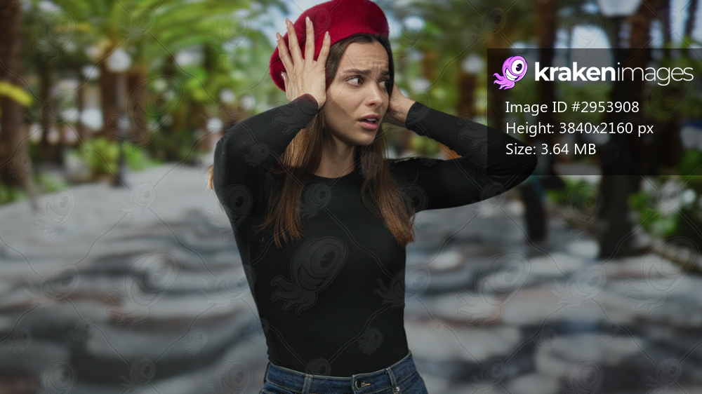 Woman with hands covering eyes and red beret on street wearing black top and jeans; anxiety uncertainty.