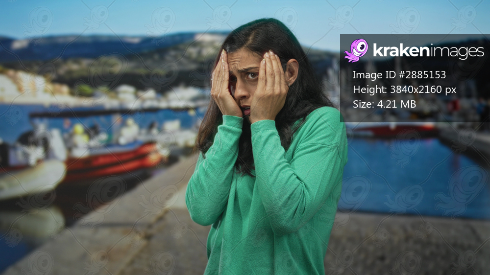 Woman with hands covering face at boat pier on seaside street beside moored boats; vulnerability anxiety.