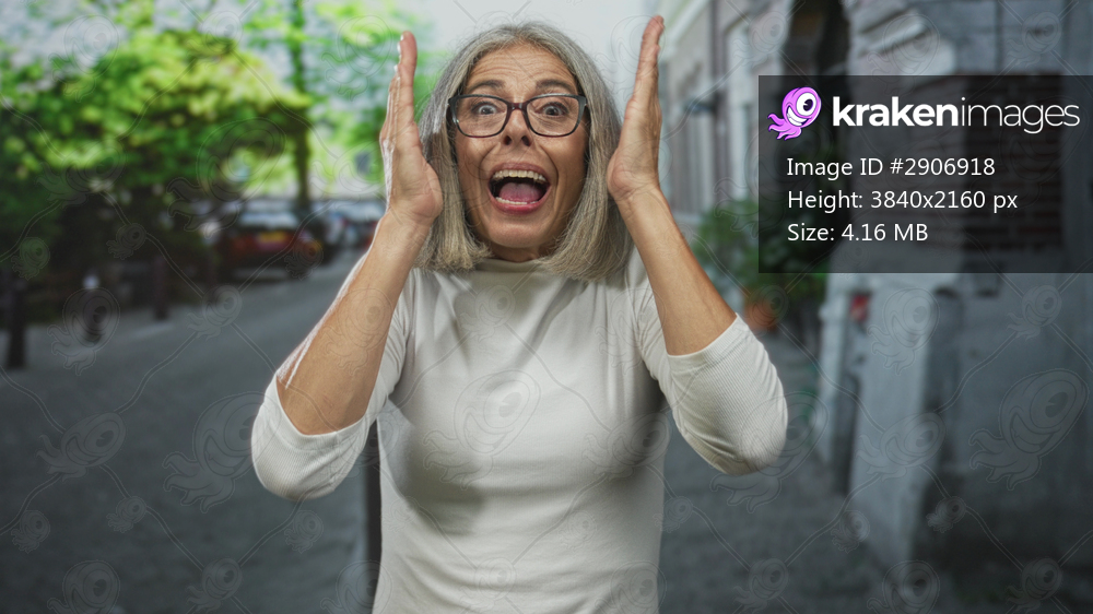 Woman hands covering face on street with forearms exposed and glasses on smiling slightly; serenity reflection.
