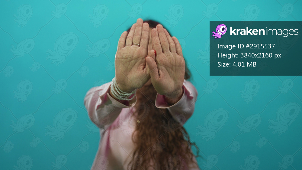 Woman with hands covering face and palms out, mouth open, long curly hair and bracelets, wearing pink shirt in teal studio; shock.