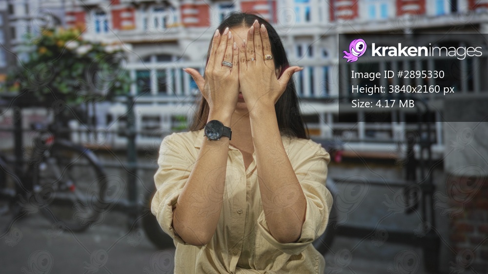 Woman with hands covering face and sticking tongue out on street in amsterdam canal district; playful spontaneous gesture.