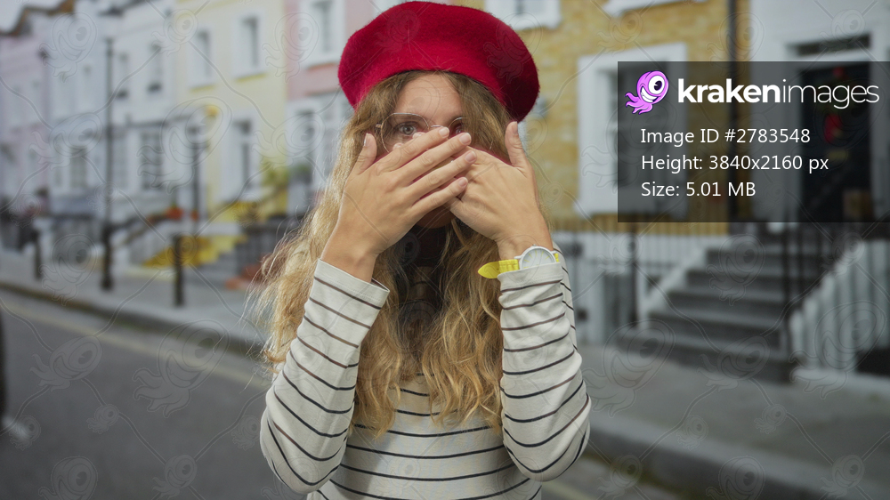 Woman with hands covering her face in a street setting wears a blonde beret and striped sweater against pastel houses with red trim for a shy portrait. - Kraken Images