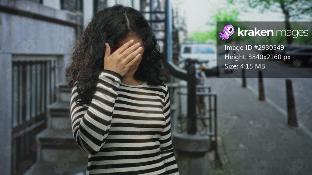 Woman with hands covering her face on a city street beside a stair entrance and parked cars; embarrassment privacy vulnerability.