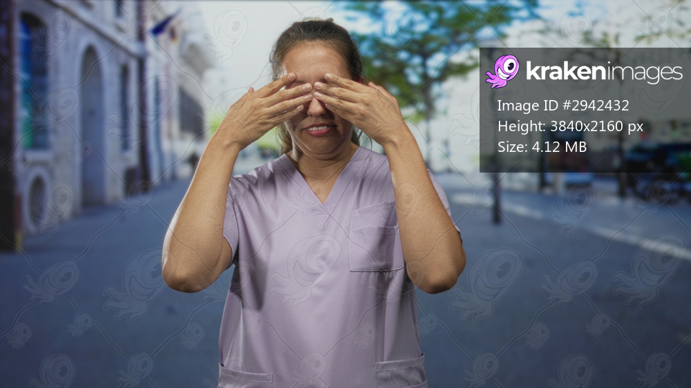 Woman with hands covering her mouth on a busy city street wearing lavender scrub top and wide eyes in a startled gesture; surprise.