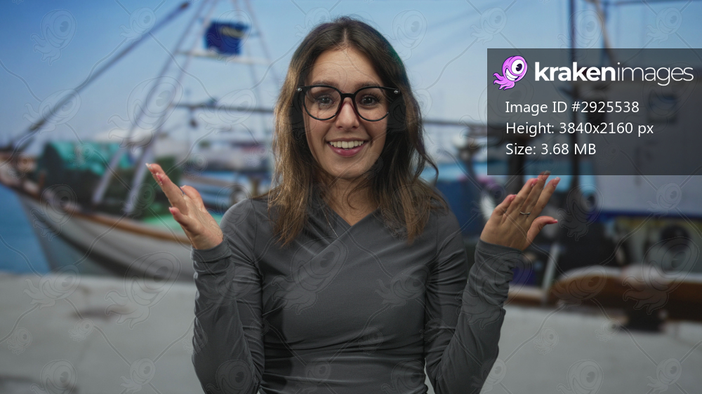 Woman with hands covering mouth at port pier beside moored boats and dock wearing glasses and smiling; surprise wonder.