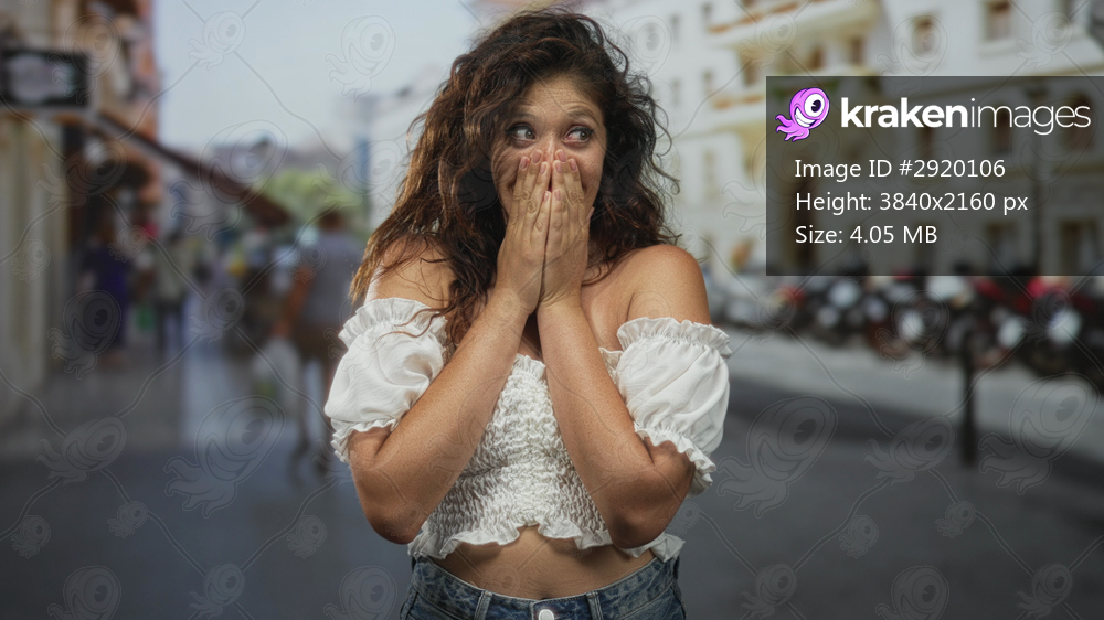Woman with hands covering mouth and eyes widened on a busy city street lined with motorcycles and pale stone buildings; surprise wonder.