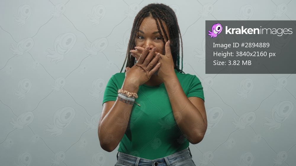 Woman with hands covering mouth, green shirt and braided hair in light gray studio; surprise secrecy.