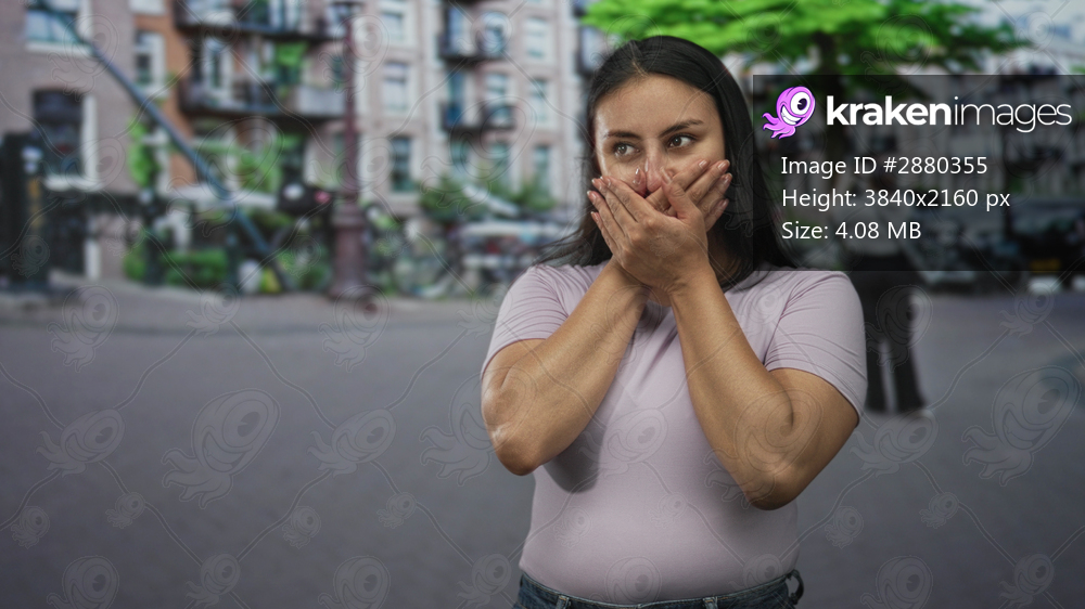 Woman hands covering mouth laughing on street, visible hands and fingers pressed to face; surprise spontaneous moment.