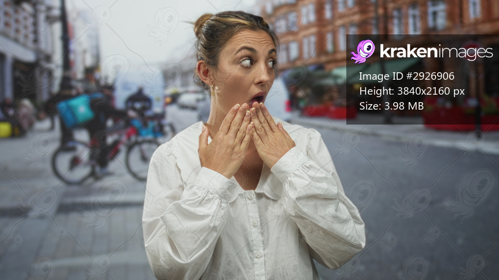Woman with hands covering mouth on a busy city street, looking sideways with wide eyes and open mouth; surprise curiosity wonder.