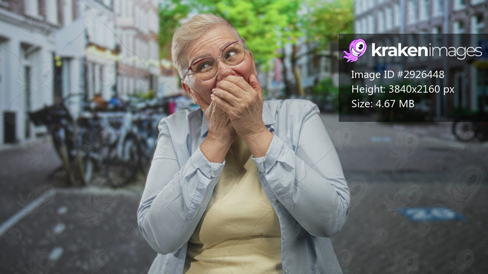 Woman with hands covering mouth on a cobbled city street near parked bicycles and brick storefronts, wearing glasses and short hair; surprise memory.