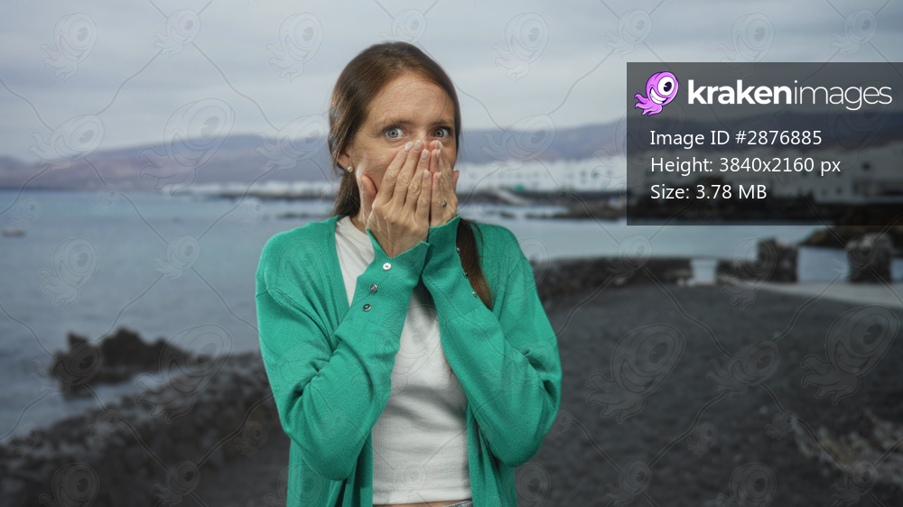 Woman with hands covering mouth on a seaside promenade overlooking rocky shore, wearing green cardigan, eyes wide; surprise reaction.