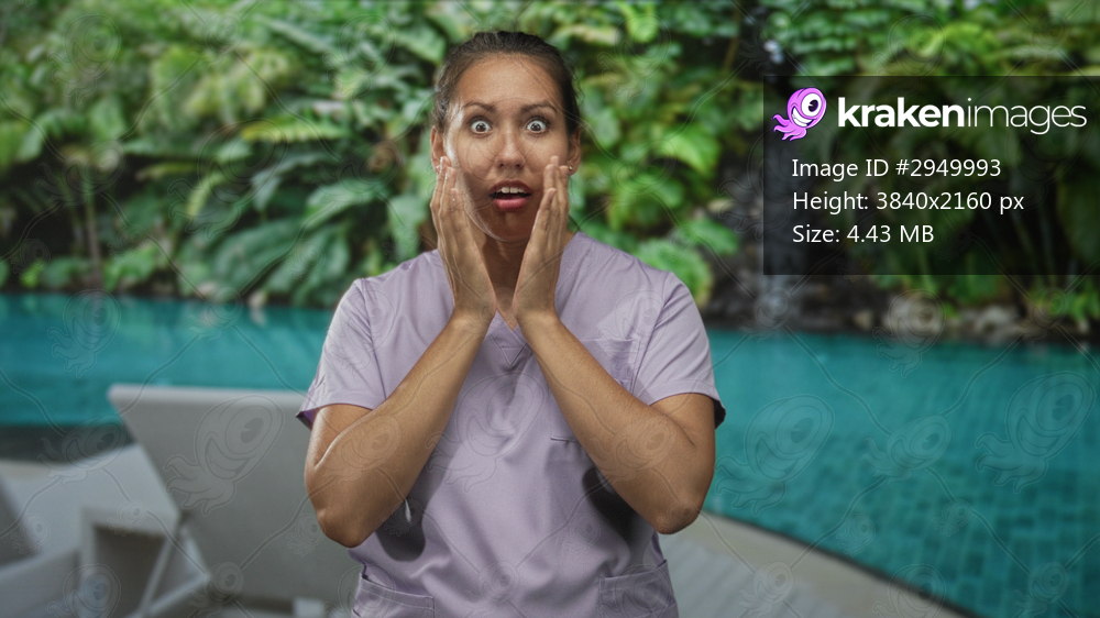 Woman with hands covering mouth wearing purple scrubs beside poolside chair and waterfall at outdoor pool; surprise candid moment.