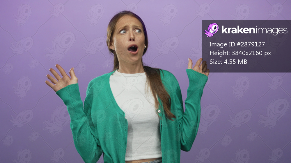 Woman hands covering mouth and wide eyes in purple studio wearing green cardigan and white top; surprise.