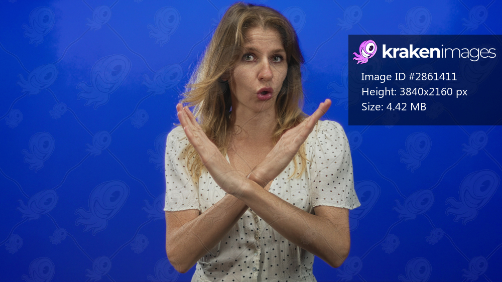 Woman with hands crossed forming an x in blue studio wearing white polka dot blouse and pursed lips; firm rejection.